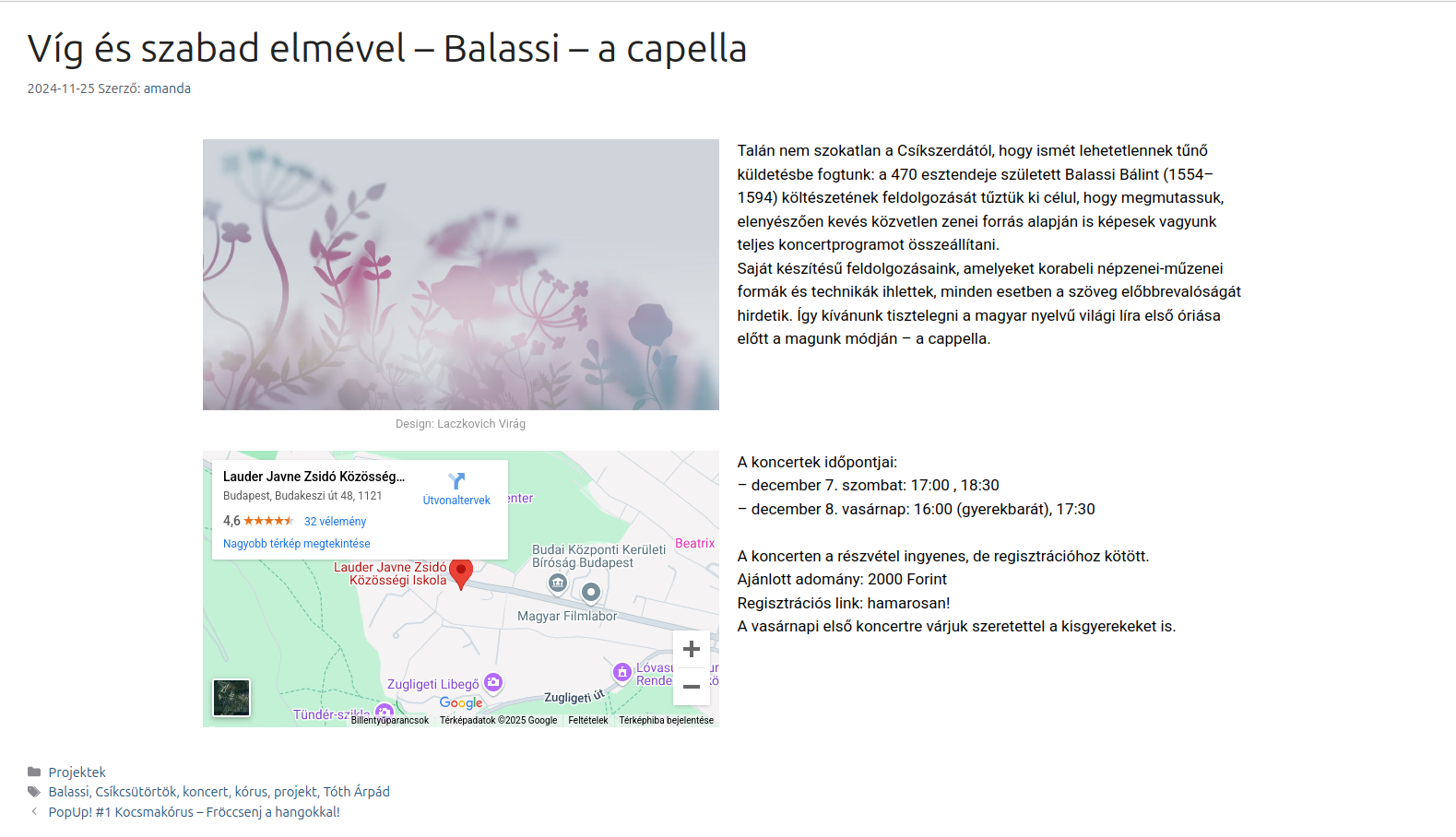 If we go into the individual projects, each project has a post, which has also changed compared to the previous ones. On the one hand, it has become much cleaner in accordance with the new design, and on the other hand, a map has been added, with which the audience can immediately see where the concert was held. And if it is a project whose concerts will only be held in the future, you can also register for the event. (The Csíkszerda concerts are usually free, but registration is required.)